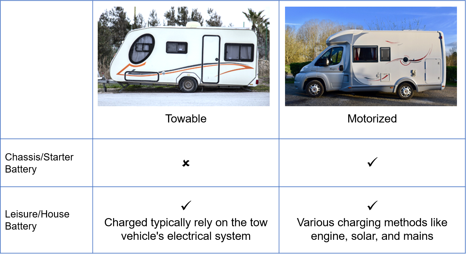 A motorized RV requires a classic battery to start the vehicle, and an additional house battery to power appliances such as air conditioner, fans, and lighting. A towable RV does not have a starter battery, and the house battery is usually charged by the towing vehicle.