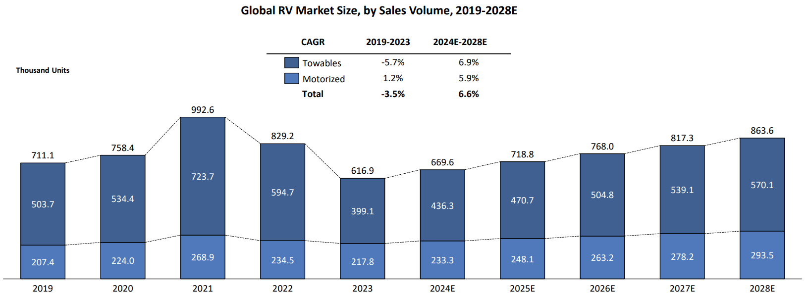 According to institutional data, the global RV market will reach almost 25 million units by 2024. In addition, annual new demand is between 700,000 and 800,000 units. Even during the COVID-19 pandemic, more and more people chose RV as a means of travel, causing sales to peak in 2021 at 992,600 units.